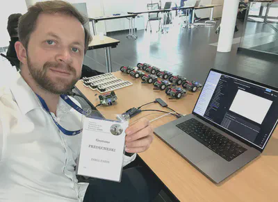 We received the Best Demo Award at the International Conference on Embedded Wireless Systems and Networks (EWSN) 2025 in Leuven, Belgium! Our demo showcased Mari (Micro-robot Access Radio Infrastructure), featuring 120 devices connected through 2 gateways: 20 DotBots controlled in real-time from a web browser with over-the-air flashing capabilities, plus 100 additional wireless nodes proving the protocol’s scalability. The system achieved average latency under 250 ms and packet delivery ratio above 95%. This was also the debut of DotBot-v3, our newest robot platform for swarm robotics research and education.